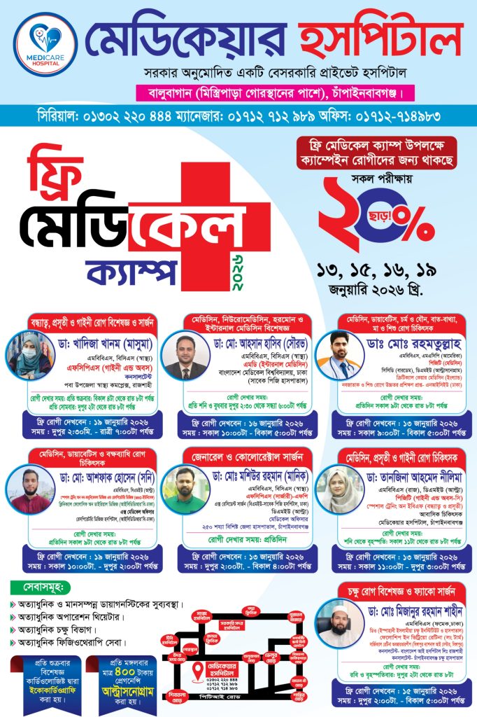 সাধারণ মানুষের স্বাস্থ্যসেবা সহজলভ্য করতে মেডিকেয়ার হসপিটাল, চাঁপাইনবাবগঞ্জ এর উদ্যোগে আগামী ১৩, ১৫, ১৬ ও ১৯ জানুয়ারি চার দিনব্যাপী ফ্রি মেডিকেল ক্যাম্প এর আয়োজন করা হয়েছে।